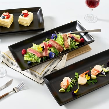 Budget–Mid (spooky-chic serveware): Gomakren 14" Black Porcelain Serving Platters (Set of 4) — sleek, moody trays that make charcuterie look bewitched (in the elegant way).